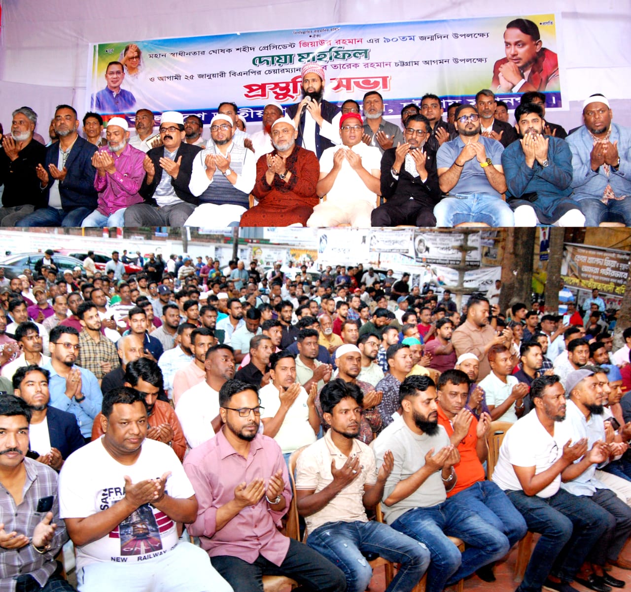 দোয়া মাহফিলে মুনাজাত পরিচালনা করেন চট্টগ্রাম মহানগর বিএনপির নাসিমন ভবনস্থ দলীয় কার্যালয় জামে মসজিদের পেশ ইমাম মাওলানা এহসানুল হক এবং শহীদ প্রেসিডেন্ট জিয়াউর রহমান বীর উত্তমকে জান্নাতের উচ্চতম মাকাম দান করার জন্য মহান আল্লাহ রাব্বুল আলামিনের দরবারে ফরিয়াদ জানান। মরুহমা বেগম খালেদা জিয়া ও মরহুম আরাফাত রহমান কোকো’র রুহের মাগফেরাত কামনা করে মহান আল্লাহর দরবারে জান্নাতের মেহমান হিসাবে কবুল করার জন্য দোআ করেন। মোনাজাতে বিএনপির চেয়ারম্যান তারেক রহমান ও জিয়া পরিবারের সকল সদস্যের সুস্বাস্থ্য ও দীর্ঘায়ু কামনা করা হয়।
