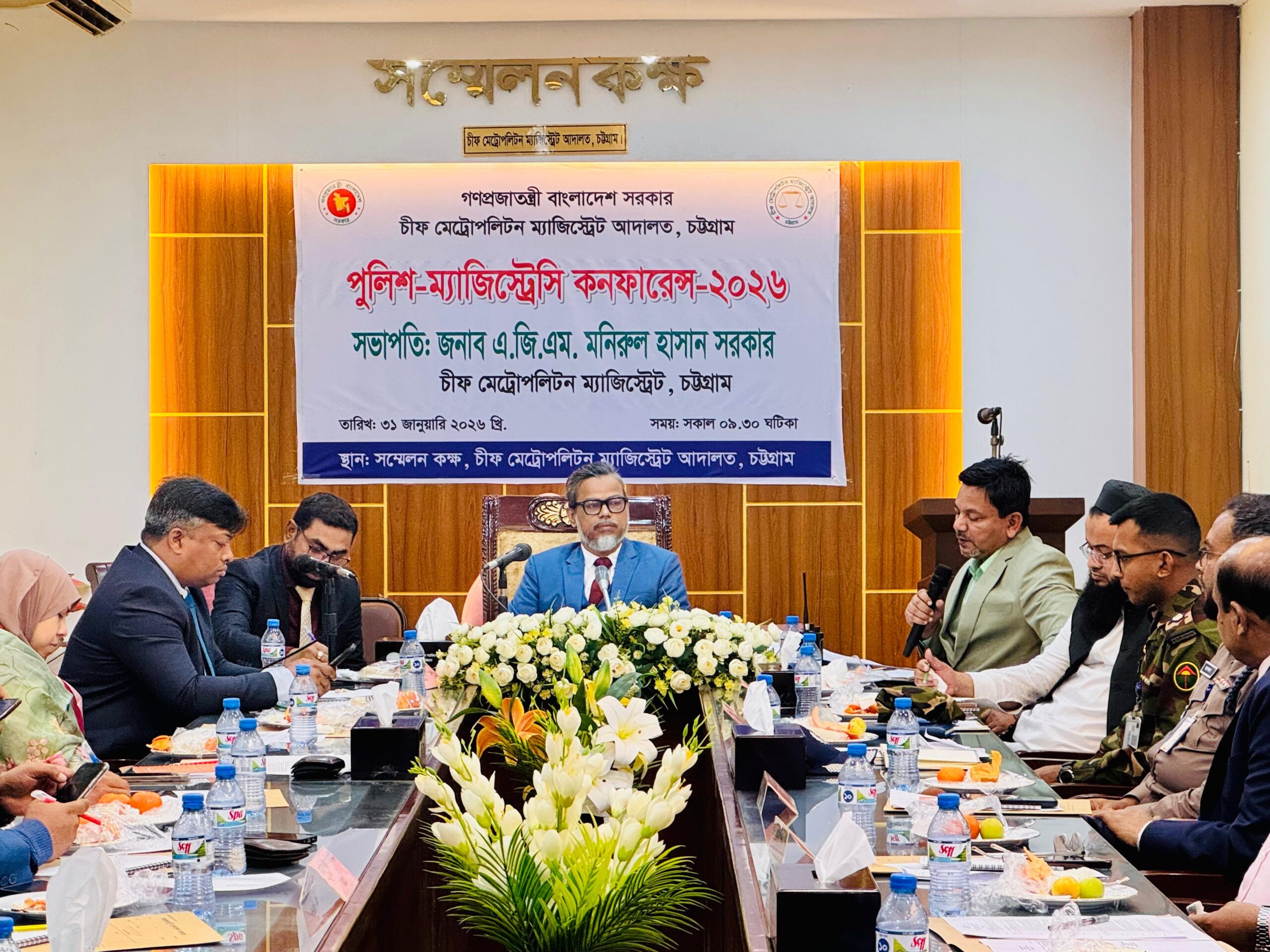 চট্টগ্রাম চীফ মেট্রোপলিটন ম্যাজিস্ট্রেট (সিএমএম) আদালতের উদ্যোগে আদালতের সম্মেলন কক্ষে পুলিশ-ম্যাজিস্ট্রেসী কনফারেন্স অনুষ্ঠিত হয়। শনিবার (৩১ জানুয়ারি) বিকেলে চীফ মেট্রোপলিটন ম্যাজিস্ট্রেট এ.জি.এম. মনিরুল হাসান সরকারের সভাপতিত্বে অনুষ্ঠিত কনফারেন্সে উপস্থিত ছিলেন অতিরিক্ত চীফ মেট্রোপলিটন ম্যাজিস্ট্রেট মো. মহিদুল ইসলাম, স্পেশাল ম্যাজিস্ট্রেট (যুগ্ম জেলা ও দায়রা জজ), চট্টগ্রাম সিটি কর্পোরেশন মো. সোয়েব খান, বিজ্ঞ স্পেশাল ম্যাজিস্ট্রেট (যুগ্ম জেলা ও দায়রা জজ), চট্টগ্রাম উন্নয়ন কর্তৃপক্ষ হামীমুন তানজীন, মেট্রোপলিটন ম্যাজিস্ট্রেট আবু বকর সিদ্দিক, মো: আলমগীর হোসেন, মোহাম্মদ মোস্তফা ও মুহাম্মদ আবুল মনছুর এবং সঞ্চালনায় ছিলেন বিজ্ঞ মেট্রোপলিটন ম্যাজিস্ট্রেট ফাহমিদা সাত্তার।